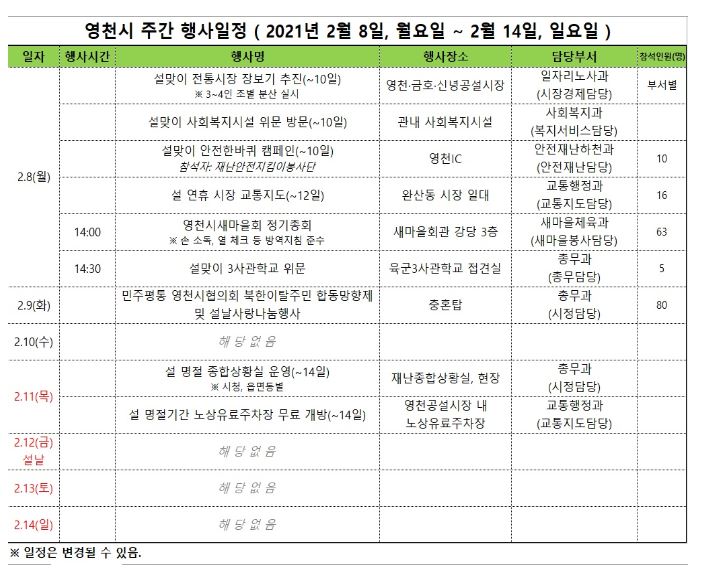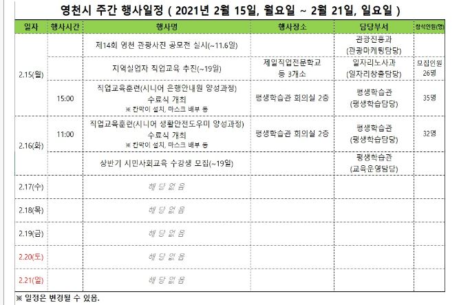 영천시 주간 행사일정 ( 2021년 10월 18일, 월요일 ~ 10월 24일, 일요일 ) 일자 행사시간 행사명 행사장소 담당부서 인원(명) 10.18(월) 도서관 시니어 프로그램 수강생 모집(~10.22) 내용: 자수 곰인형, 도자기 화분, 천연샴푸, 예쁜 식물 키우기 방문 또는 전화 접수 (시립도서관) 평생학습관 도서관담당 (054-339-7771) 12 11:00~12:00 (사)전국한우협회 영천시지부 한우산업발전 릴레이 캠페인 영천축협경제사업장 축산과 축산정책담당 (054-339-7170) 8 18:30~21:30 4차산업 창의 메이커 3D펜/프린트 강좌 개강(매주 월요일, ~12.6) 평생학습관 회의실 평생학습관 평생학습담당 (054-339-7755) 20 10.19(화) 14:30 영천청년회의소..