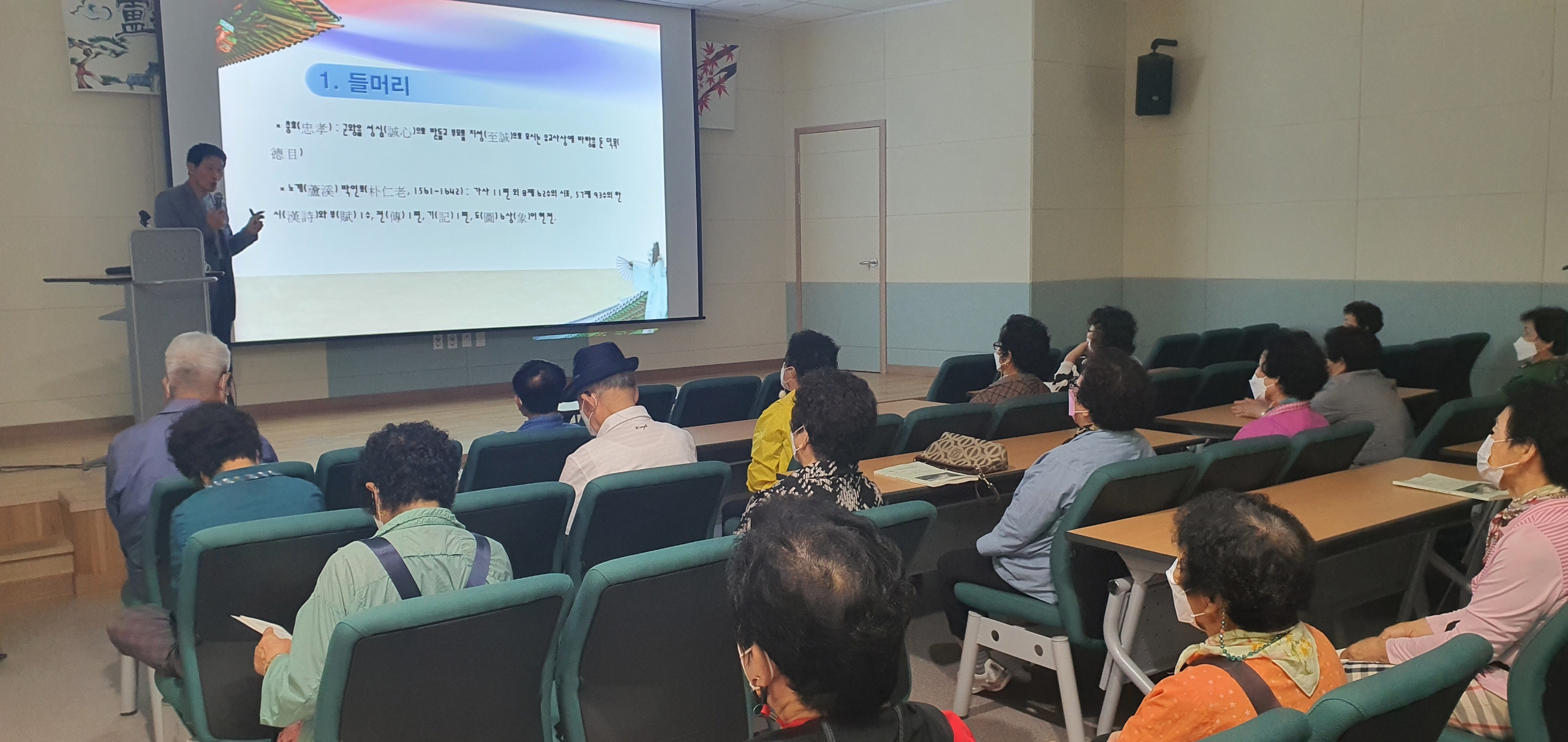 향토문화교육대학, 노계문학 강연 참석 향토문화교육대학, 노계문학 강연 참석 영천향토문화교육대학(이사장 김태식) 학생 32명은 10일 오전 북안면 도계서원을 방문하고 노계문학관에서 노계의 충효의식과 행동에 대한 강연을 들었다. 이날 강사는 박규홍 교수(경일대)가 1시간가량 강의했으며, 노계문학관에서는 매주 일요일 강연이 열린다. 영 천 시 2021.10.13
