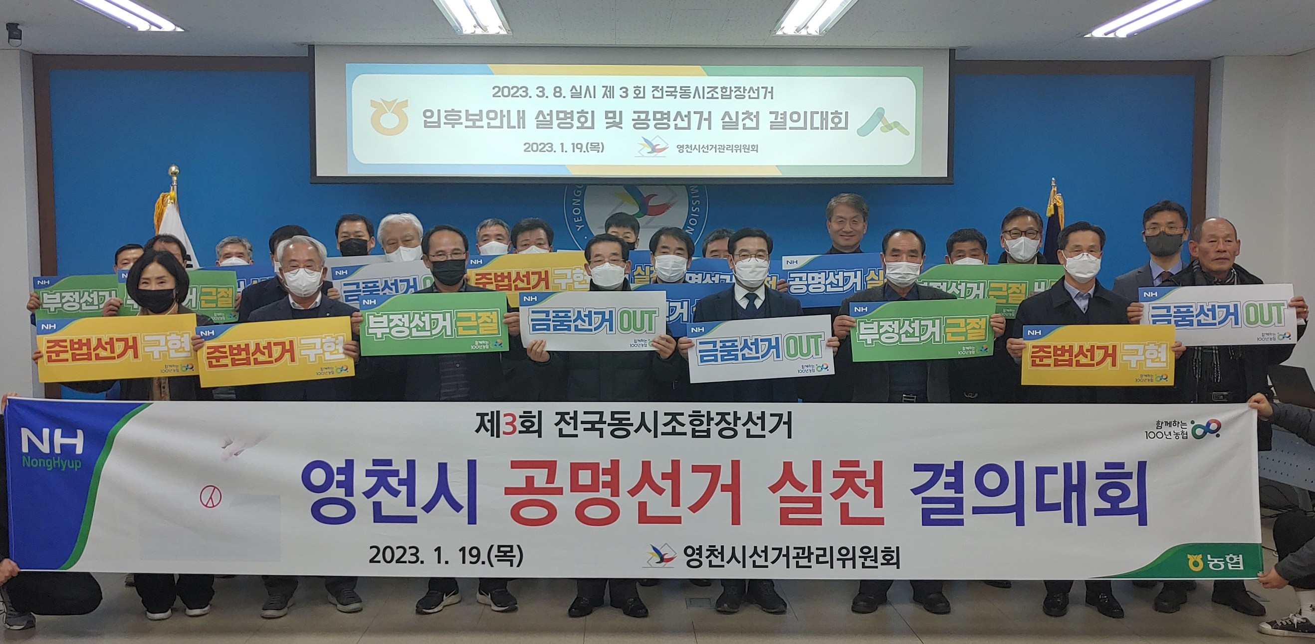 영천시선거관리위원회(위원장 김경훈)와 농협영천시지부(지부장 정재용)는 19일 제3회 동시조합장선거 입후보안내 설명회에서 공명선거 실천 결의대회를 가졌다. □ 이날 결의대회에서는 입후보 예정자 및 관계자 등 40여명이 참석한 가운데 금품수수, 상호비방, 흑색선전 등 부정선거를 근절하여 깨끗하고 공정한 선거문화 정착을 위해 최선을 다할 것을 결의했다. □ 영천시 선관위 관계자는 “기부행위 등 위탁선거법 위반행위 사전예방 및 공명선거 분위기를 조성해 깨끗하고 공정한 선거의 장이 되기를 바란다”고 말했다.
