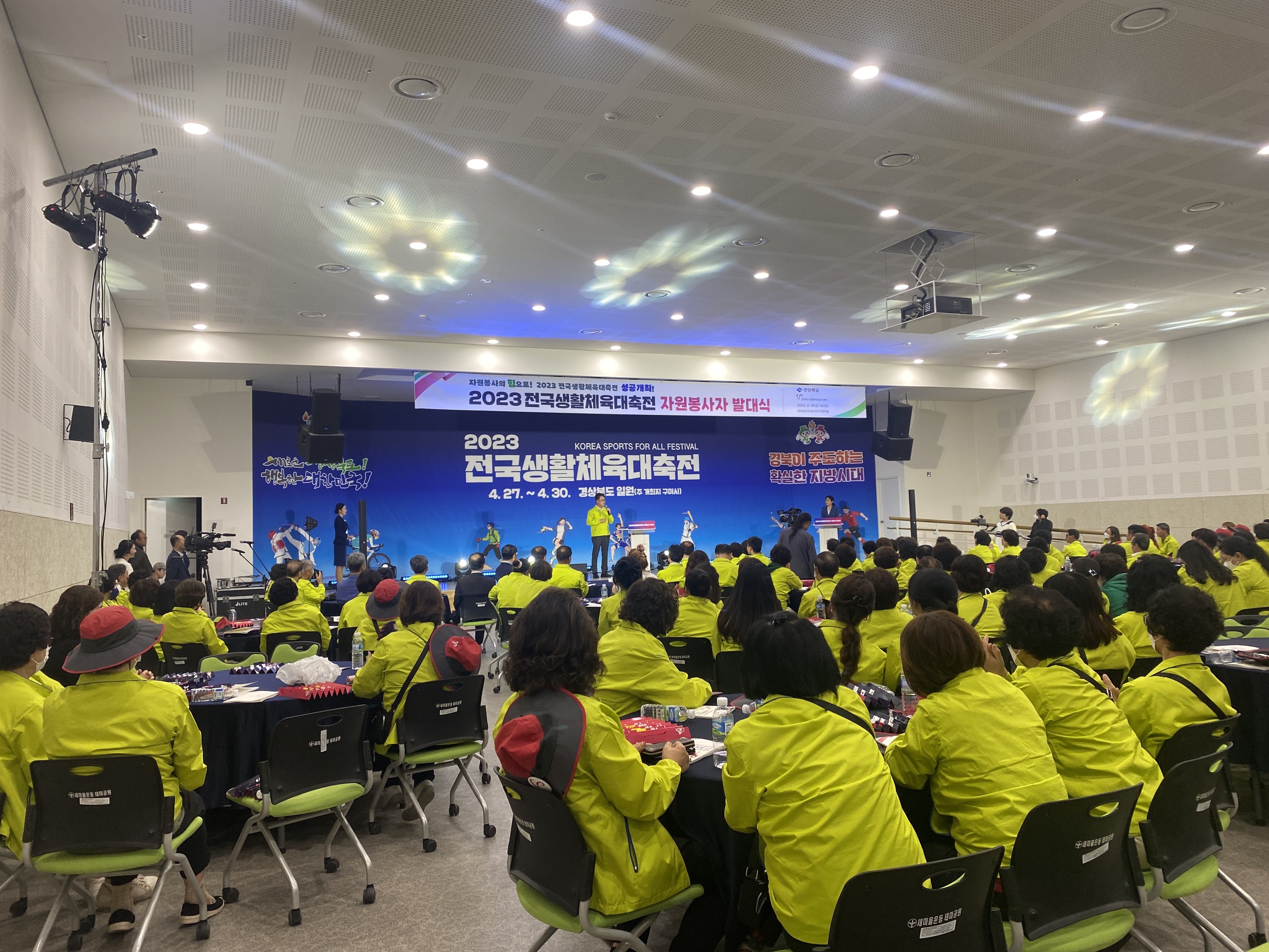 경북도와 경상북도종합자원봉사센터는 19일 구미 새마을테마공원에서「2023 전국생활체육대축전 자원봉사자 발대식」을 개최했다. 이날 행사에는 김종수 경북도 자치행정국장, 최태림 경북도의회 행정보건복지위원회위원장, 김호섭 구미부시장, 장세구 구미시의회 부의장을 비롯한 11개 시군 250여명의 자원봉사자가 참석해 2023 전국생활체육대축전 성공 개최를 위한 결의와 다짐의 시간을 가졌다. 행사 1부는 대회 운영 전반과 친절 에티켓 등 자원봉사자 교육을, 2부는 자원봉사단 결의문 낭독, 전국체전 성공기원 퍼포먼스 순으로 진행했으며, 발대식을 통해 자원봉사자들의 자긍심을 고취시키고 성공적인 체전 개최를 위한 기반을 마련하는데 초점을 뒀다. 이번 전국생활체육대축전에 참여하는 자원봉사자는 총 700여명으로 종합상황실, ..