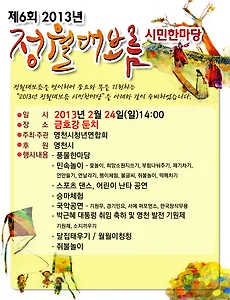 제6회 2013년 정월대보름 시민한마당 제6회 2013년 정월대보름 시민한마당 시 간 행 사 명 장 소 주 관 비고 13:00 풍물한마당 금호강둔치 문화원 풍물단 13:00 ~ 민속놀이 (체험 일반) 둔치 각 참여단체 (분야별 역할 분담) ◦ 윷놀이 연합회 ◦ 대보름맞이 희망 소원지 쓰기 연합회 ◦ 부럼나눠주기, 화남면청년회 ◦ .. 2013. 2. 21.
