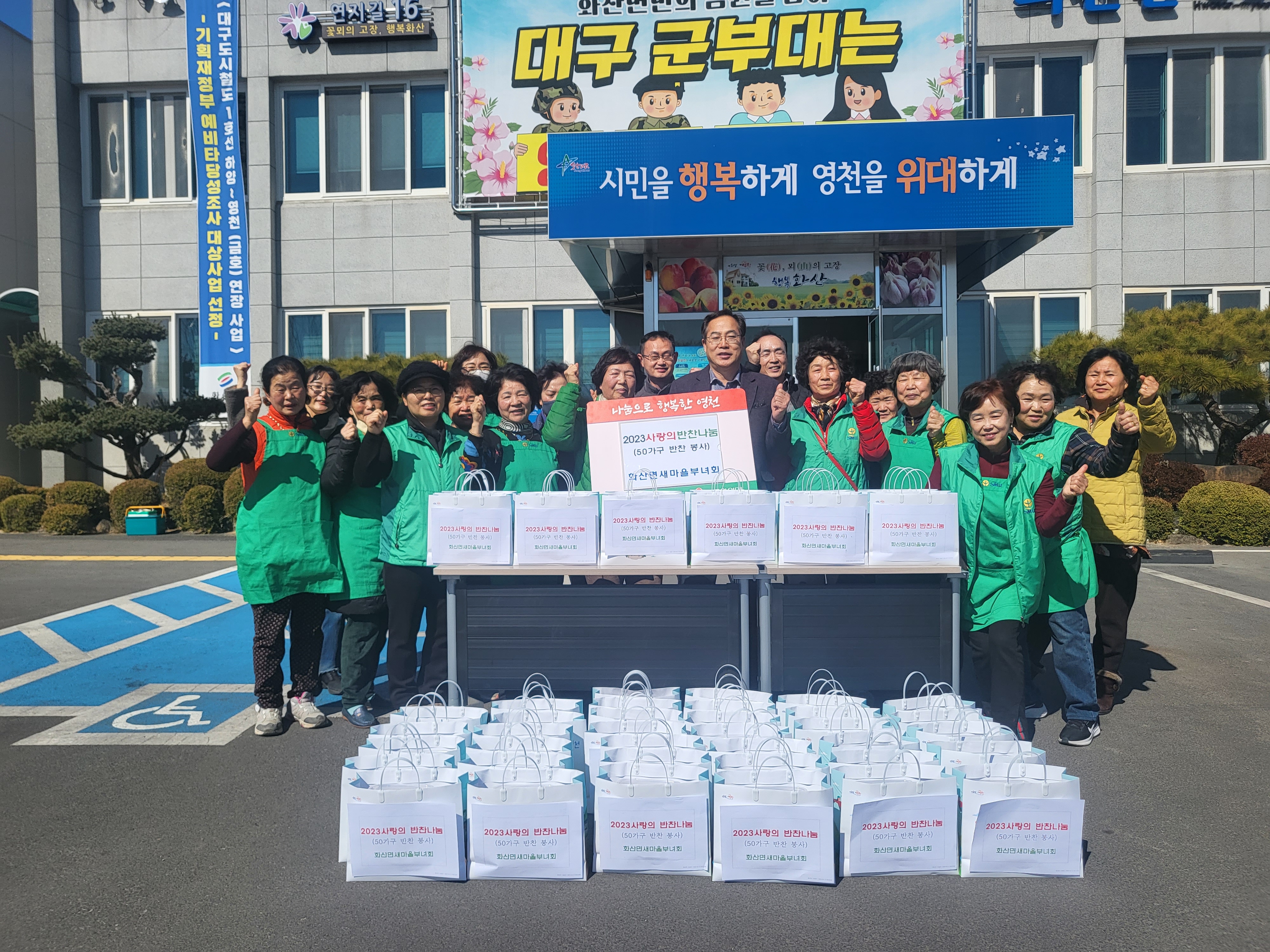 화산면 새마을부녀회, 사랑의 반찬나눔 영천시 화산면새마을부녀회(회장 김정애)는 2월 28일 지역 내 어려운 이웃들을 위해 밑반찬을 만들어 전달하는 사랑의 반찬 나눔봉사를 실시했다. 화산면새마을부녀회 회원 20여 명은 화산면민복지회관에서 불고기, 메추리알소고기장조림, 애호박전, 옛날소시지, 지역에서 생산되는 버섯과 마늘을 이용한 느타리버섯무침을 직접 조리해 저소득 가구와 독거노인 가구 50곳에 전달했다. 김정애 화산면새마을부녀회장은 “식사를 스스로 챙기기 힘든 이웃에게 조금이나마 온기를 나누고자 이번 행사를 준비하게 되었다.”며 “정성을 담아 만든 반찬을 맛있게 드시는 것을 보면 보람을 느낀다.”고 말했다.